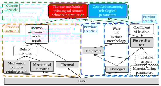 Figure 2 summarizes the detailed tribological investigation process detailing the complex structure of the material as well. Facings after production are aged in different field tests, then pins are cut from them via abrasive water jet cutting [24] for pin-on-disk investigations. Highlighted parameters from different stages are evaluated and possible correlations are searched for.