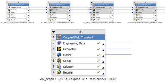 For finite element modeling, the Ansys Workbench version 2021 R2 was used. In the environment provided, coupled analyses are possible. Basically, a standalone static structural or thermal analysis is only capable of the evaluation of the effects of a certain load type at a certain moment in time. Without coupling them, modeling transient time-dependent processes would require constant switching between the two systems, finding ways to carry over displacement field results from one to the other.