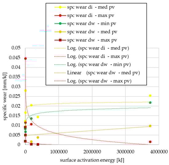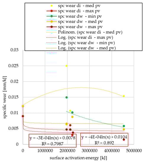 After pin-on-disk tests, the specific wear values normalized to the surface activation energy unit are shown in Figure 9 or Figure 10, depending on the use trend.
