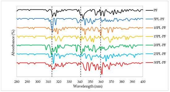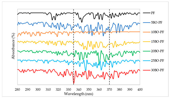 The results presented in Figure 3 and Figure 4 are the UV characterisation of phenol–formaldehyde (PF) adhesive made by substituting PF with 5–30% PL and BO, respectively. This analysis was carried out to look for alterations in conjugated phenolics and the major phenolic groups contained in the PL−PF and BO−PF resins. Maximum absorption peaks were observed to appear around 315 and 345–360 nm on PL−PF as shown in Figure 3, and at around 335–375 nm on BO−PF, as shown in Figure 4. These maximum absorptions may be attributed to conjugated phenolic structures and a similar kind of result was also reported by Ramakoti et al. [27]. It was also observed that the PL−PF resins had a stronger absorption band between 320 to 350 nm than BO−PF, which could be due to phenolic hydroxyl group ionisation during phenolation. This suggests that specific and efficient phenolation at reactive sites in the side chains causes conjugated structures to disintegrate, resulting in an increase in phenolic hydroxyl content in PL−PF resins [28]. This also explains why PL−PF has a higher viscosity than BO−PF, as discussed in the preceding section.