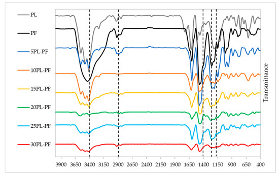 According to Lai and Idris [29] and Talabi et al. [30], peaks at around 1211–1245 cm−1 indicate the presence of guaiacyl (G) propane units, whereas 1325–1375 cm−1 indicates the presence of syringyl (S) propane units. From the FTIR spectrum of PL−PF resins, it was discovered that all PL−PF resins have intense peaks around 1211–1245 cm−1 and no peak at 1325–1375 cm−1, indicating that all PL−PF resins are rich with G-propane units, thus making them suitable for phenolic resin production.