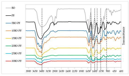 Meanwhile, Figure 6 shows the FTIR spectrum of BO−PF resins, and similar to PL−PF resins, the absorption peak positions of BO−PF resin at different substitution rates are comparable with the neat PF, proving that the BO−PF resins have a similar molecular structure to the neat PF. Nevertheless, the peak intensity varied slightly, especially at around 1030, 1211–1245, 1450–1460, 1600–1625 and 3200–3600 cm−1.