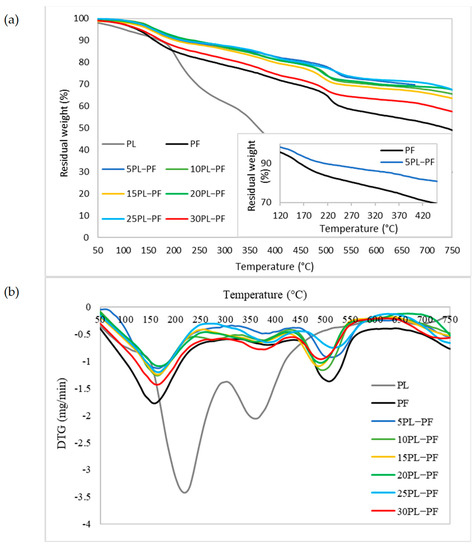 The TG thermograms also revealed that at the final stage of degradation, which was around 750 °C, the residual weight of PL−PF resins was higher than both neat PF and BO−PF, which varied from 57.6 to 66.8%, with the maximum residual weight obtained by 5PL−PF. Meanwhile, BO−PF resins recorded a residual weight of around 58–61.7%, which was 18.9–26.2% higher compared to the neat PF. This shows that the substitution of PL and BO into the PF can improve PF resin’s thermal stability.