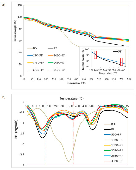 Notably, the degradation process could be delayed by increasing the amount of PL or BO in PF. For instance, the temperature of 10PL−PF after 10% degradation (Td10%) was roughly 225 °C, occurring 68 and 22 °C later than the neat PF (157 °C) and 5PL−PF (203 °C), respectively. However, when 15–30PL were added into PF, the temperature fell dramatically in a range of 171–239 °C, but still higher that the neat PF. A similar trend was also observed for BO−PF after 10% degradation, demonstrating BO’s ability to improve resin thermal stability. Td10% was observed to occur at 165 and 173 °C after 5BO and 10BO were added into the PF resin, respectively, and the temperature dropped dramatically in a range of 159–180 °C after 15–30BO were added into PF. This reflected the result of FTIR which shows that PF has a higher composition of phenol and other side-chains such as aldehydes, methyl and aliphatic compared to the PL−PF and BO−PF resins, thus making it unstable and degraded faster than those modified ones. This result was also synchronised with the residual weight data. Theoretically, besides referring to the degradation temperature, an early degradation of a sample is also indicated by a high residual weight at a given temperature [32,36]. The TG thermograms demonstrate that the residual weight of PF at about 160 °C was around 90%, whereas PL−PF resin was in a range of 92–95% and BO−PF was in a range of 90–92% (Table 3). This result shows that 10% of PF resin has been degraded, while only 5–8% and 8–10% of PL−PF and BO−PF resins, respectively, have been degraded. This clearly shows that both PL−PF and BO−PF resins are more thermally stable than PF.