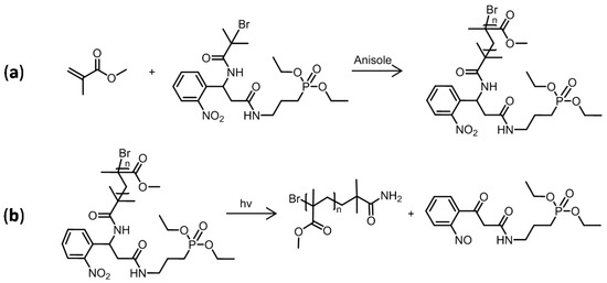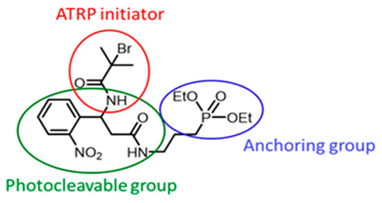 In the current work, a photocleavable SI-ATRP initiator (C20H31BrN3O7P, M = 536.35 g·mol−1, labelled PCI (Figure 2)) is synthesized and used to grow PMMA chains on Ti. This initiator has three parts: a Ti-anchoring diethyl phosphonate, an α-bromo amide ATRP initiator, and a photocleavable o-nitrobenzene. A synthesis of the PCI is conducted using a multistep synthesis involving classical organic reactions.