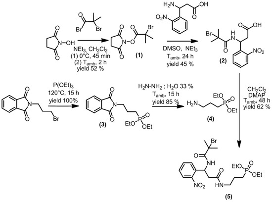 The PCI was synthesized using a five-step strategy, as depicted in Figure 5. First, bromoester 1 was obtained from a reaction between bromoisobutyryl bromide and N-hydroxysuccinimide. Bromoester 1 was then subjected to an amidation reaction with 𝛽-amino-2-nitrobenzenepropanoic acid to yield compound 2. Diethylphosphate 3 was obtained through a Michaelis–Arbuzov reaction between N-(3-bromopropyl)phtalimide and triethylphosphite. Subsequent hydrazinolysis led to the formation of amino-diethylphosphate 4. Finally, an amidation reaction between carboxylic acid 2 and amino-diethylphosphate 4 led to the formation of PCI 5. All experimental details and characterization data are reported in the supporting information.