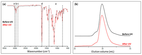 The PMMA collected from the photocleavage in the THF solution was characterized by IR spectroscopy (Figure 7a) and SEC (Figure 7b). No differences could be seen in the IR spectra, regardless of whether they were captured before or after exposure to UV radiation, and the same absorption bands are present in both spectra shown in Figure 7a.