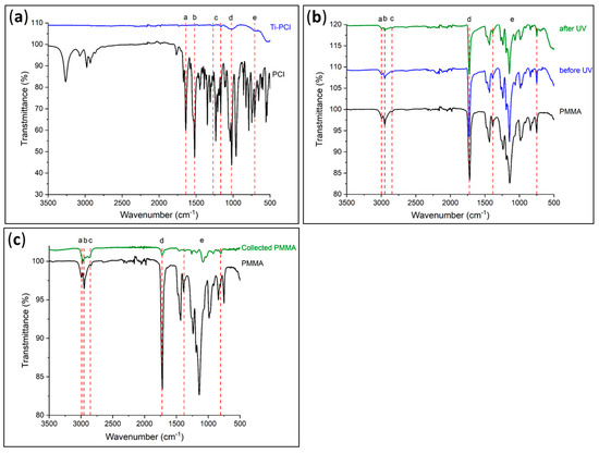 The effectiveness of the photocleavage was determined using IR spectroscopy; the acquired spectra were compared to the reference spectra of the PCI and PMMA (Figure 8a,c, respectively).