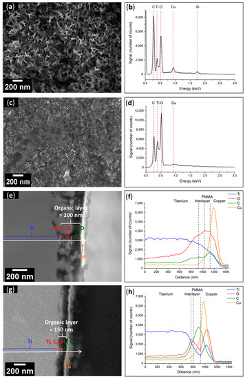These findings were supported by the cross-sectional views and linear EDX spectroscopy investigations, which showed similar results before and after UV light exposure. Furthermore, the thickness of the organic layer was reduced following UV exposure (≈200 nm before and ≈150 nm after). To illustrate this, SEM pictures of the sections and linear spectroscopic EDX analyses of the Ti-PMMA plates before (Figure 10e,f) and after (Figure 10g,h) UV radiation treatment are displayed. For both before and after UV exposure, four layers were observed, including from left to right, (i) the Ti substrate; (ii) an interlayer containing Ti, O, and C recovered from (iii) the polymer layer where C and O signals were at their highest intensities; and finally, the previously deposited Cu layer.