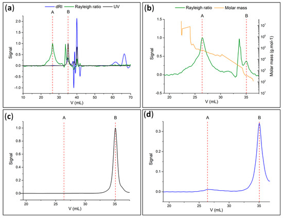 (a) Chromatogram of photocleaved PMMA recovered in solution (green: Rayleigh ratio or light-scattering signal; blue: refractometer signal; black: UV at 254 nm); (b) molar mass (green: light-scattering signal; orange: molar mass); (c) signal in UV at 254 nm and (d) refractometer signal of photocleaved PMMA recovered in solution.