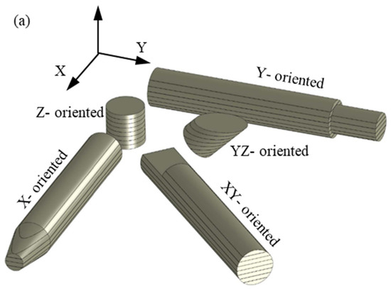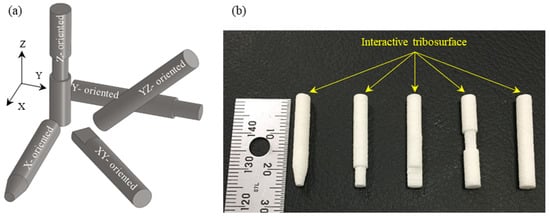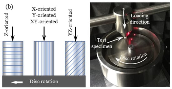 The glass bead-filled PA12 test specimens, in the form of pins with a 4 mm diameter and a 25 mm length, were fabricated by the SLS technique in an EOS P380 system using EOS-PA 3200 GF tribological-grade powder. Fabrication parameters are given in Table 1. In the build chamber, the specimens were oriented along the X-axis, Y-axis, Z-axis, at 45° to the X-axis (XY-plane), and at 45° to the Z-axis (YZ-plane), as shown in Figure 1a. For easy sorting of the fabricated specimens, different micro-cuts were introduced in the CAD models to mark the different orientations and in such a way that it did not affect the load-carrying capacity of the specimen (see Figure 1b). The test specimens were built along the positive Z-axis, and a set of three test specimens was manufactured along each orientation. The selected build orientations were to yield three different layers’ orientations relative to the sliding plane of the stainless-steel disc (see Figure 2). The tribo-surfaces of the test specimens were the whole circular pin ends. Once the fabrication process was completed, the parts were taken off the support and cleaned with sandblasting to remove any sticking powder. Post-processed active tribo-surfaces were then kept out of dirt, humidity, and any oily substances.