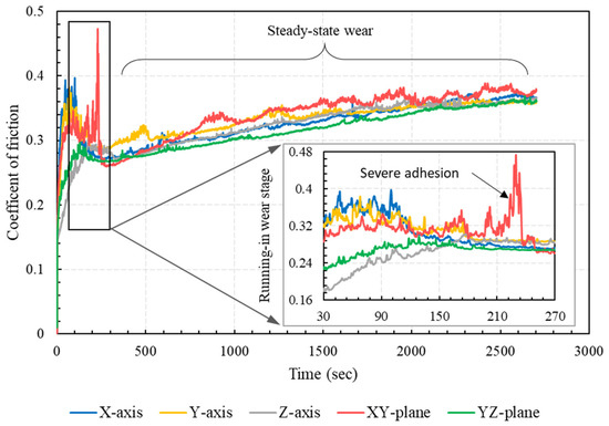 The COF of PA 3200 GF specimens sliding against steel was obtained by dividing the measured friction force by the applied normal load. The evolution of the COF with times for specimens with different build orientations is shown in Figure 5. The results showed that there was a sharp increase in the COF at the beginning of the experiment, which corresponded to the running-in stage (early 5 min of dry sliding). This sharp increase was owed mainly to the gradual increase in the real contact area, where more adhesive junctions were formed and sheared away, causing such a sharp increase in the coefficient of friction. Additionally, it was noticeable that the parts built along the Z-axis and the YZ-plane exhibited comparatively lower COF during the running-in stage, while the specimen built in the XY-plane had the highest COF during this stage. After the running-in stage, the results showed that all specimens, except those built along the XY-plane, had very similar values of COF. The specimen built along the XY-plane showed unstable frictional properties throughout the experiment duration.