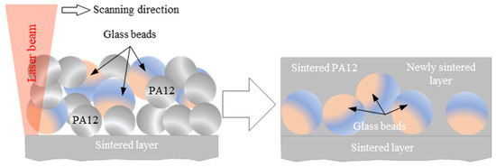 A possible explanation for the relatively low COF of specimens built along the Z-axis and the YZ-plane might be the sintering-induced inhomogeneity of glass bead distribution in the sintered layers. Since the glass beads (soda lime glass) had a higher density compared to PA12 (2.5 g/cm3 vs. 1.02 g/cm3), the glass beads tended to precipitate in the layer during the laser-sintering process, motivated by the low melt viscosity of PA12. (See Figure 6 for the schematic description of this possibility.) During experiments, more precipitated glass beads slid against the steel disc and were worn mainly by abrasion, which resulted in lower values of the COF. On the other hand, the unstable frictional properties of the XY-oriented specimen, manifested by the fluctuating COF, was attributed mainly to the severe adhesion at the polymer/steel interface [26].
