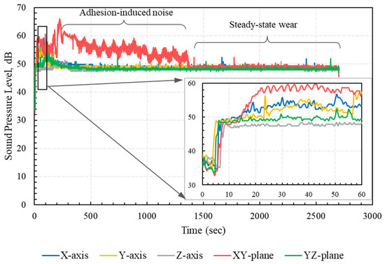 The measured friction-induced noise levels of specimens with different build orientations are shown in Figure 7. The results showed clearly that higher noise levels were associated with higher COF. Accordingly, the specimens built along the Z-axis and the YZ-plane exhibited low friction-induced noise, whereas the specimen built along the XY-plane showed the highest level of frictional noise, corresponding to the highest COF levels. Moreover, at a steady-state region where the COFs of all specimens were very close, the friction-induced noise levels were very close. The synchronous variations of friction-induced noise and friction coefficient are further depicted in Figure 8. The figure shows synchronous trends of friction-induced noise and COF at the running-in stage of the specimen oriented along the XY-plane; the noise increased as the friction force increased and vice versa. These results are in good conformity with previous findings that higher COF values (larger than 0.3) are associated with strong interfacial adhesion [26]. In most cases, such strong adhesion, when combined with anisotropic cohesion in the polymer matrix, can result in the subsurface shearing of the polymer rather than shearing the interface. On the other hand, it has been reported that weak interfacial adhesion is associated with low COF (less than 0.1), and junction shearing occurs at the interface [26].
