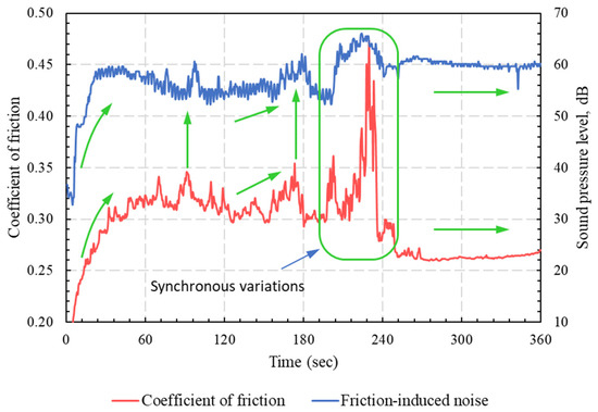 Synchronous behavior of the friction coefficient and the friction-induced noise for XY-oriented specimens.