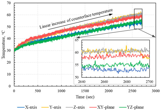 It was estimated that most of the work performed against friction is converted into heat energy at the sliding interface [27]. Additionally, surface deformation, including ploughing and/or cutting, is considered a major source of subsurface heating, while adhesion can induce surface, as well as subsurface, heating. Furthermore, repeated formation and shearing of adhesive junctions contributes to the pronounced vibrations of subsurface molecules, which result in subsurface heating [26,29]. As PA12 is a semi-crystalline polymer, sintered PA12 includes regions of amorphous structure, as well as regions of crystalline structure. Since the crystallinity percent of PA12 powder was about 49.1%, while the crystallinity of laser-sintered PA12 dropped to 24.5% [30], most of the contact area of PA 3200 GF was of an amorphous microstructure. Meanwhile, the stiffness of amorphous regions in laser-sintered PA12 fell rapidly as the interface temperature rose above the glass-transition temperature [27,29]. Thus, frictional heating significantly affected the tribological properties of polymers and polymer composites, as it could result in the pronounced softening of amorphous regions. Consequently, as the interface temperature increased, the adhesion component dominated the frictional behavior at the PA 3200 GF/steel interface. The disc temperature at the vicinity of PA 3200 GF/disc contact region was measured with an infrared laser sensor, and the measured temperature was used as a reasonable approximation of the interface temperature, since it was not straightforward to measure it directly. The approximate interface temperature measurements are plotted in Figure 9 for specimens with different build orientations. The results showed that the specimens built along the X-axis and in the YZ-plane experienced low interface temperature, compared with those built along other orientations. The results further emphasized the mutual effects of COF and interface temperature, where a higher COF resulted in high interface temperature, which, in turn, softened the amorphous regions in the substrate layer, causing strong adhesion and further increase in the COF.