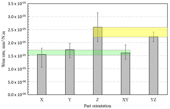 where is the wear volume (mm3), P is the applied load (N), and L is the sliding distance (m). Figure 10 shows the specific wear rates of PA 3200 GF specimens with different build orientations after 45 min of dry sliding against the steel disc. The figure shows clearly that the parts built along the X-axis, Y-axis, and XY-plane exhibited the lowest wear rate, while the specimens built along the Z-axis and the YZ-plane experienced a high wear rate. In other words, the PA 3200 GF specimens with their layers oriented normally to the steel disc (sliding surface) showed lower wear rates than those with layers oriented parallel or inclined to the disc surface. The results from this figure highlight the importance of choosing the appropriate layer orientation relative to the sliding plane for the purpose of controlling the wear rate of the PA 3200 GF composite.