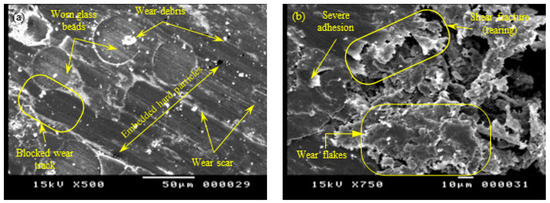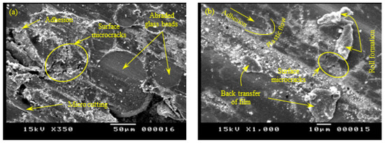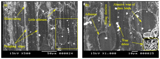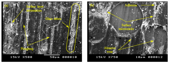 Characterization of the tribo-surface is an extremely important tool for controlling the friction and the wear behavior of polymer composites. Therefore, the sliding surfaces of PA 3200 GF specimens built along the five different orientations were investigated using a scanning electron microscope (SEM), and the results are shown in Figure 11, Figure 12, Figure 13, Figure 14 and Figure 15. The SEM of the tribo-surface of the X-axis oriented specimen, shown in Figure 11, revealed the following important remarks: (1) abrasive wear was the dominant wear pattern of glass beads, while adhesive wear, abrasive wear, and surface fatigue wear patterns coexisted side-by-side in regions of sintered PA12; (2) the existence of surface microcracks that were perpendicular to the sliding direction accentuated the prominent role of the adhesive wear pattern; (3) the roll formation, which is shown in Figure 11b, was the result of strong adhesion at real contact areas, which caused the initiation of surface and/or subsurface cracks. Repeated frictional traction on the surface resulted in crack propagation and later, coalescence, to form wear debris that rolled between the sliding surfaces and deformed in the shape of long rolls [32]; (4) the worn surface was characterized by the presence of wear flakes that might be the result of back transfer from the countersurface; and (5) worn glass beads resulted in the appearance of crushed glass powder on the sliding surface.