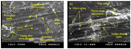 SEM of the tribo-surface for the Y-oriented specimen (50 N, 0.25 m/s, and 45 min) at 500× (a) and 1000× (b) magnification.