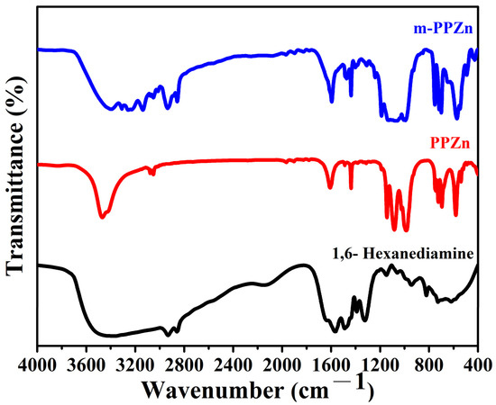 Figure 1. FTIR spectra of the PPZn, 1,6-hexanediamine and m-PPZn.