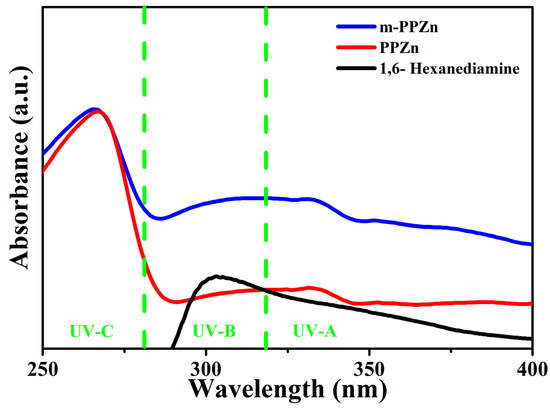 Figure 2. UV-Vis absorbance spectra of the PPZn, 1,6-hexanediamine and m-PPZn. The green lines in this figure illustrate the UV-A, UV-B, and UV-C regions.