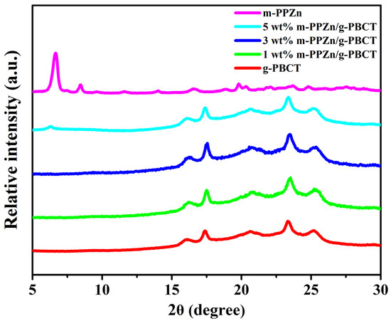 Figure 3. WAXD patterns of the m-PPZn, g-PBCT, and various weight ratios of g-PBCT/m-PPZn composites.