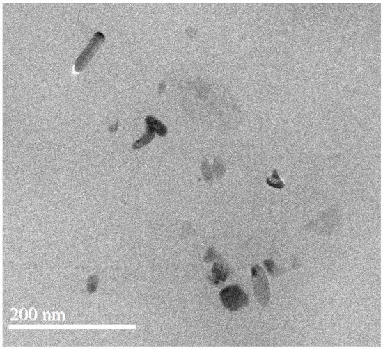 The WAXD profiles of the m-PPZn, g-PBCT, and g-PBCT/m-PPZn composites are shown in Figure 3. According to previous investigation [12], three strong diffraction peaks at 2θ = 6.34°, 12.49°, and 18.68° were obtained for the PPZn, which characterize to the crystal planes of (010), (020), and (030) Miller index, respectively. These diffraction peaks of m-PPZn were clearly shifted to 2θ = 3.30°, 6.61°, and 8.47°, which indicates the increase in the interlayer spacings of m-PPZn. Therefore, the interlayer spacings of PPZn and m-PPZn determined via Bragg’s equation were 1.39 and 2.67 nm, respectively. These results also demonstrate that the intercalation of 1,6-hexanediamine was successfully inserted into the interlayer spacing of PPZn. For the WAXD data of g-PBCT, they present five strong diffraction peaks at 2θ = 16.10°, 17.40°, 20.66°, 23.37°, and 25.17°, which were contributed to the crystal planes of (0−11), (010), (−101), (100), and (1−11) Miller index of the polybutylene terephthalate (PBT) crystallite [5]. By the incorporation of m-PPZn content, the peak positions and intensities of the m-PPZn almost disappeared. By adding the m-PPZn content to 5 wt%, the PBCT/m-PPZn composites presented a little trace of the main diffraction peak of m-PPZn at 2θ = 3.30°. These results suggest that the crystal structure of the PBCT does not change with the addition of the m-PPZn, and the stacking structure of the m-PPZn in the g-PBCT/m-PPZn composites presents almost delaminated conformations. Moreover, Figure 4 reveals the morphology of 5 wt% g-PBCT/m-PPZn composites examined using TEM. From this image, the stacking structure of m-PPZn is not clearly noted, which is in accordance with the WAXD curves. Therefore, both WAXD and TEM data present that the g-PBCT polymer matrix was intercalated into the interlayer spacing of m-PPZn, which is approximately delaminated in the composite materials.