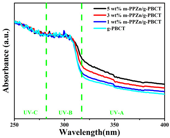Figure 5. UV-Vis spectra of the g-PBCT and various weight ratios of g-PBCT/m-PPZn composites. The green lines in this figure illustrate the UV-A, UV-B, and UV-C regions.