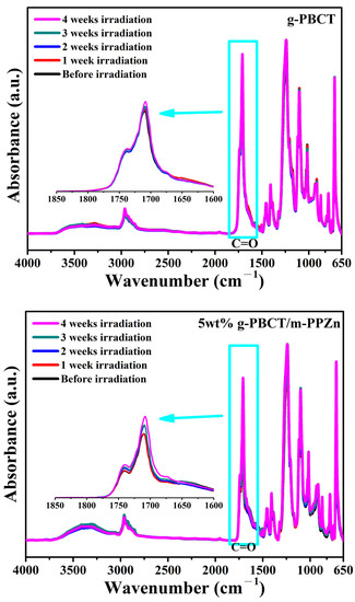 Figure 7. Change of FTIR spectra of g-PBCT and various weight ratios of g-PBCT/m-PPZn composites before and after 4 weeks UV irradiation times.