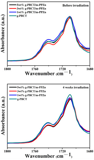 Figure 6 shows the FTIR spectra of g-PBCT and 5 wt% g-PBCT/m-PPZn composites at different UV irradiation times. Enlarged FTIR spectra of all samples from 1600–1850 cm−1 are also inserted in this figure. All FTIR spectra are very similar in both samples and the band region at 1650–1750 cm−1 is appointed to the C=O stretching of the ester group [20,25]. The absorption peaks C—H stretching vibrations were observed at 2856 and 2946 cm−1 peaks, which the peak at 2856 cm−1 was employed as the reference peak for the determination of the carbonyl index. During the photooxidation processes, numerous carboxyl groups and aldehyde were fabricated. Therefore, the amount of carboxyl groups altered at various photooxidation times, which is attributed to the increase and broadening of C=O absorbance peak at 1709 cm−1 as the irradiation time increases. Before the UV irradiation, the FTIR spectra of g-PBCT and 5 wt% g-PBCT/m-PPZn composites revealed an absorbance peak at 1709 cm−1 and the intensities of these peaks were slightly increased after irradiation, which implied the chemical decomposition of the g-PBCT through photodegradation process [26,27]. Similarly, the FTIR spectra of 1 wt% and 3 wt% g-PBCT/m-PPZn composites were also examined, and the results were close to that of 5 wt% g-PBCT/m-PPZn composites. All experimental data indicate that the photodegradation behaviors and mechanism of g-PBCT and various weight ratios of g-PBCT/m-PPZn composites at different UV irradiation times are similar. Figure 7 shows the FTIR spectra of g-PBCT and various weight ratios of g-PBCT/m-PPZn composites before and after 4 weeks UV irradiation times. Before the UV irradiation, the absorption peaks of carbonyl group of all samples are very close to each other. The absorption peaks of carbonyl group of the pure PBCT and various weight ratios of g-PBCT/m-PPZn composites continues to increase as the UV irradiation time increases. After 4 weeks of the UV irradiation, the comparison of the FT-IR curves for the g-PBCT/m-PPZn composites with pure g-PBCT matrix presents the increase in the C=O peak intensity for the various weight ratios of g-PBCT/m-PPZn composite is less than that of pure g-PBCT. These results reveal that the m-PPZn can significantly prevent the g-PBCT photodegradation process.