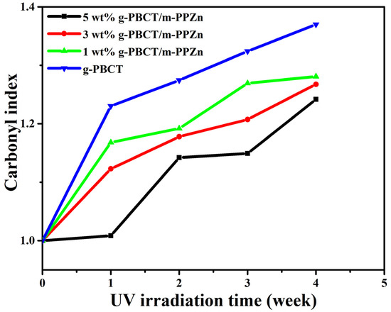 Normally, the degree of photodegradation of g-PBCT can be shown using the change in the carboxyl groups of g-PBCT [20]. The intensity ratio under the carbonyl absorbance to the reference peak appointed to the AC=O and AC—H group (AC=O/AC—H) was employed to calculate the development of photodegradation. A low value of AC=O/AC—H implies less photodegradation occurrence in the g-PBCT polymer matrix. Figure 8 presents the changes in the carbonyl index of various weight ratios of g-PBCT/m-PPZn composites and pure g-PBCT at different UV irradiation times. Detail data of carbonyl index for all samples are also displayed in Table 1. It can be seen that the carbonyl index of each sample rises weekly with the irradiation process, which implies the photodegradation process occurs as the irradiation process begins. Compared to the various weight ratios of g-PBCT/m-PPZn composites, the value of carbonyl index of the pure g-PBCT is relatively higher. At the same irradiation time, the value of carbonyl index decreases gradually with increasing the content of m-PPZn in the composite. These findings reveal that the m-PPZn is a useful stabilizer for g-PBCT under irradiation and hinders the photodegradation of polymer matrix. The decrease in the carbonyl index with increasing m-PPZn component shows that the m-PPZn prevents the photodegradation of the PBCT. This enhancement in the photostability of g-PBCT with the m-PPZn indicates that the m-PPZn contains great absorbability within the UV band shown in Figure 2, which can prevent high energy UV light successfully and decrease photodegradation of the g-PBCT matrix.