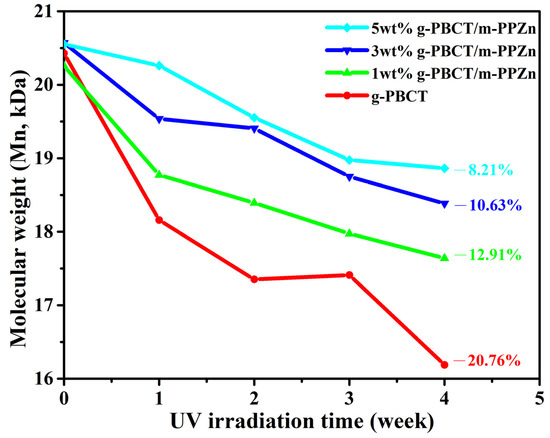 Figure 9 shows the change of number-average molecular weights (Mn) of the PBCT and various weight ratios of g-PBCT/m-PPZn composites at different UV irradiation times. Details of the change of Mn for the pure PBCT and various weight ratios of g-PBCT/m-PPZn composites are also presented in Table 2. All results present a significant change of molecular weight in the first week, which decreases with increasing the m-PPZn content. The molecular weight of the pure PBCT and various weight ratios of g-PBCT/m-PPZn composites continues to decrease as the UV irradiation time increases from 1 week to 4 weeks. After 4 weeks of irradiation, the 5 wt% g-PBCT/m-PPZn retains the highest molecular weight as compared to pure g-PBCT, 1 wt% and 3 wt% g-PBCT/m-PPZn composites, exhibiting the best photodegradation resistance. In particular, the molecular weight of g-PBCT and 5 wt% g-PBCT/m-PPZn composites after photodegradation for 4 weeks was decreased by about 20.76% and 8.21% as compared to the samples before photodegradation, respectively. These results indicate that the m-PPZn can play a considerable role in photodegradation protection for PBCT polymer matrix. A similar investigation was reported by Chen et al. [28]; they found that the incorporation of inorganic layered montmorillonite (MMT) could pay a regular contribution to the UV reflection ability, causing less photon energy interacting with the biodegradable PBAT. Since a common drawback of polymers related with the outdoor purpose is the chain scission, which significantly decreases their functioning [29]. In particular, in the use of mulch films in agricultural applications, it is important to investigate the photodegradation of polymers by UV light. Therefore, this work offers an appropriate approach to enhance the g-PBCT photodegradation resistance.