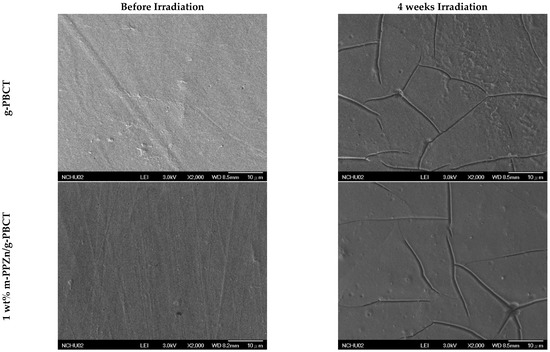 Figure 10. SEM images of g-PBCT and various weight ratio of g-PBCT/m-PPZn composites before and after 4 weeks UV irradiation times.