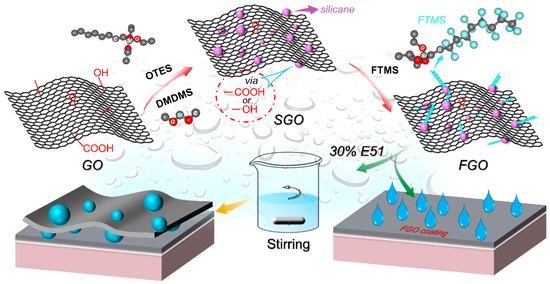 First, we weighed 50 mg of FGO and placed it in the oven to dry and obtain FGO powder. Then we weighed 2.0 g of epoxy resin E51 and diluted it with ethyl acetate solvent to 30% for reserve, added FGO powder and epoxy curing agent D230 to 30% E51 spare resin, and used a high-speed dispersing machine to disperse the mixture at a high speed of 6000 rpm for 15 min. Finally, we put it in the oven to heat up to 120 °C and kept it for 20 min to obtain E-FGO composite coating. The reaction process is shown in Figure 1.