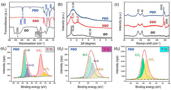 (a) FT-IR, (b) XRD, (c) Raman, and (d1–d3) XPS spectra patterns of GO, SGO, and FGO.