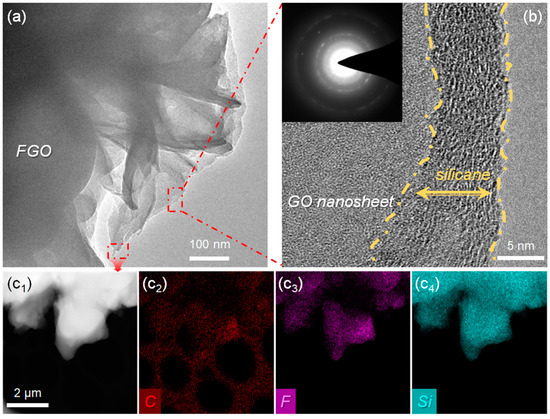 GO nanosheets present a typical 2D morphology, and the lateral size of GO was approximately 3–5 μm, as shown in Figure S3. TEM images of the FGO are shown in Figure 3a, in which FGO presented a typical silk-like morphology of 2D materials, which demonstrated that the modification process does not destroy the intrinsic structure of GO. Furthermore, the clear folded edges of the nanosheets suggest the thinness of the FGO nanosheets. A high-resolution TEM image of the enlarged area is shown in Figure 3b, in which, in addition to the GO nanosheet, an amorphous layer with a thickness of 5~10 nm can be clearly observed around the nanosheet surface. In addition, the selected area electron diffraction (SAED) of FGO demonstrated in Figure 3b sanctioned the amorphous structure of the shell layer. Importantly, the appearance of F and Si elements in the EDS mapping results further illustrated the successful modification of GO, as shown in Figure 3(c1–c4).