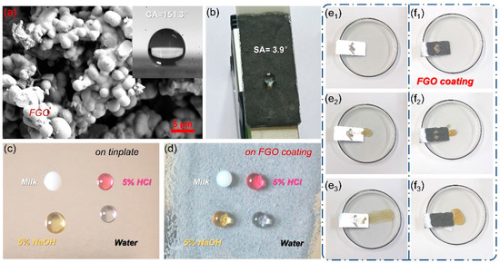 (a) State diagram of rolling angle and (b) water contact angle of FGO coating. Performance diagram of different liquid drops on the (c) tinplate and (d) FGO coating and self-cleaning diagram of the (e1–e3) tinplate and (f1–f3) FGO coating.