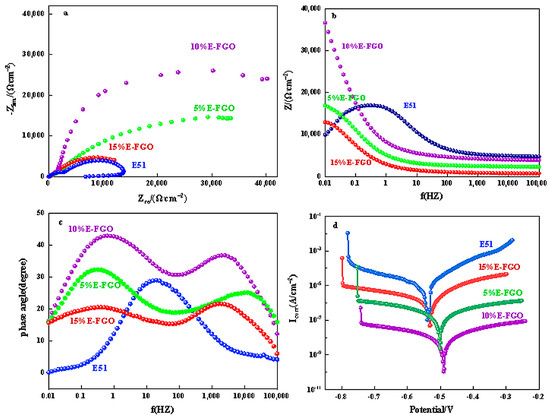 Figure 6a shows the electrochemical impedance and bode spectra of E51, 5% E-FGO, 10% E-FGO, and 15% E-FGO coatings immersed in a 3.5% NaCl solution, where the samples all have a capacitive arc. Moreover, the plots diameter shown in Figure 6a indicates the solution resistance and charge transfer during the corrosion process and is proportional to the corrosion resistance of the sample, where the sample would take on excellent corrosion resistance performance with a large diameter, which is an important parameter for the corrosion resistance performance of the coating [43]. There are obvious differences in the capacitance arc sizes of the four coatings, where the pure E51 coating exhibits the smallest capacitance arc diameter while the 10% E-FGO coating possesses the largest. It can be seen with the doping of FGO that the E51 resin could greatly improve its corrosion resistance. Likewise, when the content of FGO is higher than 10%, the capacitance arc diameter of the E-FGO coating becomes smaller [44].
