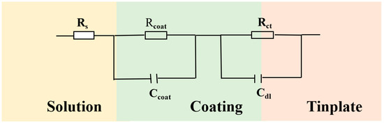 Figure 7 shows the equivalent circuit diagram of E51 and E-FGO, where Rs represents the solution resistance and Ccoat is the constant phase element for preparing the coating. Rcoat represents the resistance of the coating during preparation, Rct is the transfer charge resistance, and Cdl is the constant phase element of the electric double layer.