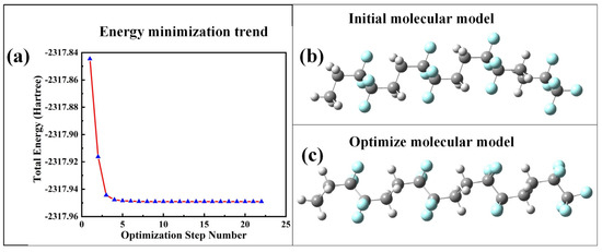 PVDF has a large molecular mass, and it is impractical as hundreds of thousands of molecules are required to perform simulations under different electric field strengths. In this study, models with different DPs were selected for pre-simulation. According to the results, it was found that the degree of polymerization had little influence on the results of the study. Combined with the previous analysis of the relationship between the aggregation degree and consumption of machine time, it is found that the value of the aggregation degree has little influence on the research content of this paper. Moreover, the purpose of this work is to study the overall effect of an electric field on the polymer, and an intramolecular study is not our primary purpose, so it is not necessary to use molecular models with tens of thousands of degrees of polymerization. Therefore, the α-phase molecular model of PVDF is constructed in this paper, as shown in Figure 3, to simulate the microscopic mechanism of PVDF molecules under the action of an electric field. Specific steps are as follows. The b3lyp/6-311g* method based on density functional theory is used to optimize the geometric configuration of the initial molecular model of PVDF (Figure 4b), and the stable conformation of molecules with the lowest energy is obtained. The molecular model is shown in Figure 4c, and the energy minimization trend is shown in Figure 4a, where gray represents carbon atoms, white represents hydrogen atoms, and blue represents fluorine atoms. The same method and base group are used to apply values from 0 to 0.0175 a.u. (1 a.u. = 5.142 × 1011 V/m) along the horizontal direction of the molecular chain, respectively. The optimization and single-point energy calculation are carried out, and the microscopic mechanism of the electrical aging of PVDF materials is studied.