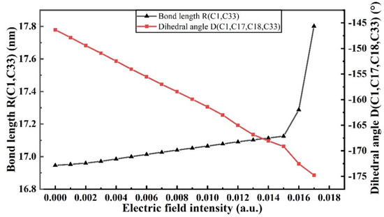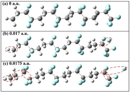 Under the action of an external electric field, which is an electric dipole field, the chemical bond length and dihedral angle in the molecules will change accordingly, so as to characterize the change in the molecular geometric structure under the action of an electric field. R(C1,C33) represents the distance between the leftmost and rightmost C atoms of molecular chains, and D(C1,C17,C18,C33) represents the angle of twist of molecular chains. The specific changes in the bond lengths and dihedral angles of PVDF molecules are shown in Figure 5. The bond length of R(C1,C33) gradually increases with the increase in the intensity of the external field, particularly when the intensity of the external field increases from 0 to 8.7414 × 109 V/m (0.017 a.u.), which is due to the transfer of positive and negative charges in the molecular system under the action of the electric field, producing the effect of a certain stretching on the molecular chain. D(C1,C17,C18,C33) changed from −146.341° to −174.769°, which gradually stretched the molecular structure and reduced the stability of the molecular geometric structure. The dashed circle represents that the chemical bond has been broken, when no external electric field is added, as in Figure 6a. When the external electric field is 8.7414 × 109 V/m (0.017 a.u.), the C-H and C-F bonds at the left and right ends of the backbone are broken, as shown in Figure 6b. When the external electric field reaches 8.9985 × 109 V/m (0.0175 a.u.), the internal molecular chain is broken, generating free radicals, as shown in Figure 6c, and the insulation is completely broken down.