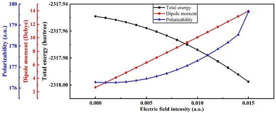 Variation in total molecular energy, dipole moment, and polarizability at different electric field intensities. (Polarizability: 1 a.u. = 1.6488−41 C2 m2 J−1).