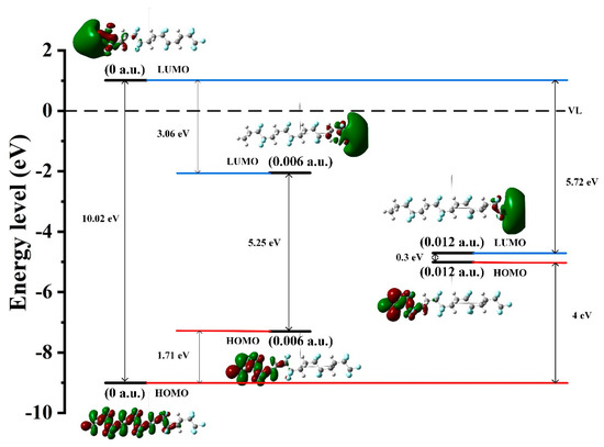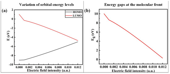 In order to analyze the electronic motion characteristics of PVDF, the frontier orbital energy level, energy gap (Eg), and orbital composition of molecules under different external electric fields are calculated, respectively, and the calculation results of the energy level and Eg are shown in Figure 8. The size of Eg is defined as the difference between the energy levels of the lowest unoccupied orbital (LUMO) and the highest occupied orbital (HOMO). According to the frontier orbital theory [37], the higher the energy of an electron in the HOMO orbital of molecules, the less bound it is, and the easier it is for the electron transition to occur. The lower the energy of the LUMO orbital, the easier it is to accept electrons. Figure 8a shows that the HOMO energy level of PVDF increases with the increase in the electric field strength, indicating that the electrons of its orbital are more prone to transition. The LUMO energy level decreases continuously with the increase in electric field strength, indicating that its orbital is easier to obtain electrons. The Eg reflects the ability of electrons to transfer from occupied orbitals to empty ones. The smaller the Eg, the more easily the electron is excited and the more reactive the molecule is. It can be seen from Figure 8b that the Eg of PVDF gradually decreases with the increase in electric field intensity, indicating that the activity of the chemical reaction of molecules is continuously enhanced and the stability is reduced. When the electric field exceeds 6.1704 × 109 V/m (0.012 a.u.) in the simulation calculation, the optimization does not converge, indicating that the structure is on the verge of failure.