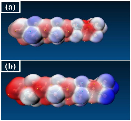 In order to analyze the microscopic change characteristics of the space charge inside PVDF under a continuous electric field, this paper uses the changes in the trap energy level, orbital cloud map, and electrostatic potential surface as a basis for discussion. Figure 9 shows the energy level distribution and frontier orbit map (MO) distribution of PVDF when the electric field intensity is 0, 3.0852 × 109 V/m (0.006 a.u.), and 6.1704 × 109 V/m (0.012 a.u.), respectively, which can more intuitively reflect the motion characteristics of the space charge at the microscopic level. It can be seen from the distribution of MO map that the HOMO orbital and the LUMO orbital are mainly concentrated on the left end of the molecular chain before the electric field is applied, which is easily attacked by electrophile reagents and electrophilic reactions occur. However, the effect of the external electric field causes the distribution of the molecular front track to change greatly, and the active reaction site of molecules also changes accordingly, as shown in Figure 9. When the electric field strength is 3.0852 × 109 V/m (0.006 a.u.), the LUMO orbital shifts in the opposite direction. When the electric field reaches 6.1704 × 109 V/m (0.012 a.u.), the LUMO orbital moves towards the end of the chain, and the HOMO orbital also moves to the left end of the chain. The left and right sides of the molecular chain show nucleophilic and electrophilic activity, respectively. Without an external electric field, the electrostatic potential distribution on the molecular surface is as shown in Figure 10a. When the electric field reaches 6.1704 × 109 V/m (0.012 a.u.), the molecular chain shows a more positive electrostatic potential at the left end and a more negative electrostatic potential at the right end, as shown in Figure 10b, which also corresponds to the performance of the molecular trap energy level mentioned above. This phenomenon indicates that the applied electric field leads to the continuous decrease in the LUMO energy level and the increase in the HOMO energy level, which will also change the active site of the PVDF reaction. When the electric field reaches 6.1704 × 109 V/m (0.012 a.u.), the change in energy level distribution is more obvious. At the same time, the HOMO and LUMO orbital energy levels are very close, and the Eg between the HOMO orbital and LUMO orbital is only 0.95eV. At this time, PVDF will be in the semiconductor state. Electrons can move freely in the valence band and the conduction band to form a current, and the insulation performance of PVDF will fail.