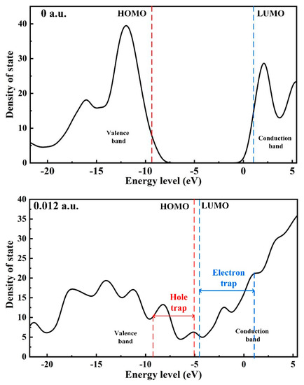 The density of states (DOS) mainly refers to the density of the distribution of molecular orbitals at different energy levels. The density of molecular states can intuitively reflect the distribution of hole traps and the electron trap energy level density of molecular orbitals, and each peak can represent the distribution of a trap energy level [38]. The HOMO and LUMO orbital energy levels correspond to the positions of the valence band top and conduction band bottom, respectively. Under the action of an electric field, a certain amount of deep traps and distribution of the shallow trap energy level appear near the valence band and the conduction band, as shown in Figure 11. With the continuous action of the electric field, the density of trap energy levels formed by molecular orbitals will further increase. The HOMO orbital energy level shifts to a higher energy level, which introduces more hole traps near the valence band. The LUMO orbital energy level moves to the direction of the lower energy level, and more electron traps are introduced near the conduction band. Finally, the number of electron traps is higher than the number of hole traps. This difference between the number of holes and electron traps can indicate that the effect of the electric field will strengthen the ability for electronic transition inside PVDF, and it is easier to capture the free electrons or injected charges in the insulation material.