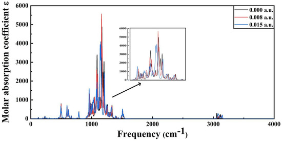 The infrared spectra of PVDF under different electric field intensities are shown in Figure 12 and Figure 13. The infrared spectra of molecules under a low electric field intensity and high electric field intensity are compared with the infrared spectra under the condition of no electric field as the reference. As can be seen from Figure 12, when the electric field intensity is below 7.713 × 109 V/m (0.015 a.u.), the infrared spectrum does not change greatly, indicating that the intensity of the low electric field has little influence on the molecular structure, and the molecular system still maintains the stability of the structure. However, when the electric field intensity is above 8.2272 × 109 V/m (0.016 a.u.), the infrared spectrogram changes greatly, as shown in Figure 13. The main difference is that the peak value of absorption fluctuates greatly, the infrared activity of the vibration mode in many intervals is significantly enhanced, and the peak value of the corresponding absorption peak is significantly increased. The stretching vibration is intensified at C-H at 2949 cm−1 and C-F at 678 cm−1 at the end. Virtual frequency does not represent any real vibration; when the structure of the molecules is no longer stable, virtual frequency will appear in the infrared spectrum. When the electric field intensity continues to increase, the virtual frequency appears in the infrared spectrum, indicating that the structure of molecules is not stable and structural damage has occurred. The critical external electric field of the molecular space’s structural destruction is the starting point of insulation material aging, which will inevitably lead to the destruction of cable dielectric materials, thereby reducing the electrical strength of cables and finally causing the polymer insulation breakdown phenomenon.