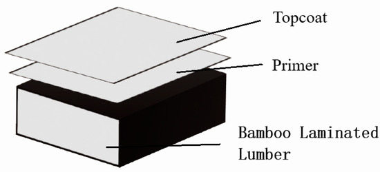 In this study, bamboo laminated lumber was finished with one-layer primer coating and one-layer topcoat coating (Figure 1). Moreover, the coating weight of primer and topcoat was maintained at 80 ± 5 g/m2. Before the primer coating, the bamboo laminated lumber was placed at room temperature and sanded with a 240 # sandpaper until the surface became smooth. Before the topcoat coating, it was also sanded with 320 # sandpaper until the surface was smooth. After finishing, it was immediately dried in a temperature and humidity chamber. The single-factor experimental method was used; Table 2 lists the drying conditions of the WBP film used in this study.