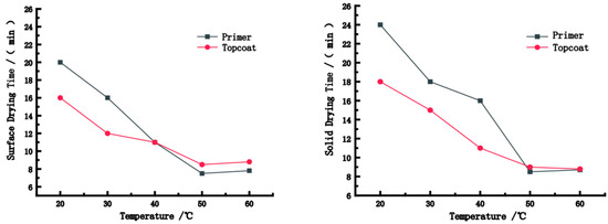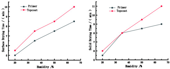Figure 3 shows the surface and solid drying time of the paint films under different humidity values. Under the same temperature and wind speed conditions, with the increase in humidity, the surface and solid drying time increased and tended to remain stable. The longest surface/solid drying time of the paint films in this experiment was observed under a humidity of 65%; the surface drying and solid drying time for the primer were 8.5 min and 10 min, respectively, and that for the topcoat were 9 min and 11 min, respectively. The dying rate reached its maximum value under a humidity of 20%, where the surface and solid drying time of the primer were 5 min and 5.5 min, respectively, and that of the topcoat were 5.5 min and 6 min, respectively. The increase in relative humidity led to the increase in the ability of the substrate to absorb water continuously, decreasing the drying rate of the paint film. However, owing to the excessive density of water molecules in the air, the ability of water molecules inside the coating to diffuse into the air was affected. Therefore, with the increase in relative humidity, the drying rate of the paint film decreased. In addition, owing to the loss of heat on the coating surface, the numerous water molecules in the air can liquefy on the coating surface, forming small water droplets that condense on the surface of the paint film, resulting in the phenomenon of a white paint film. The thickness of this white paint film increased with relative humidity. Therefore, to avoid this phenomenon and improve the drying rate, the humidity of 20% is optimum.