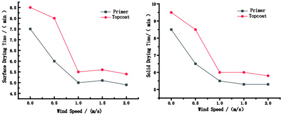 The longest surface/solid drying time of the paint film in this experiment was observed under a wind speed of 0 m/s; the surface and solid drying time of the primer were 7.5 min and 8.5 min, respectively, and those of the topcoat were 8.5 min and 9.5 min, respectively. The dying rate reached its maximum value under a wind speed of 1 m/s, where the surface drying and solid drying time of the primer were 5 min and 5.5 min, respectively, and those of the topcoat were 5.5 min and 6 min, respectively. Excessive wind speed caused cracks, crusts, wrinkles and other adverse effects on the paint film. Choosing an appropriate wind speed can improve the quality of paint film; thus, a wind speed of 1 m/s is optimum for the drying process of the paint film.