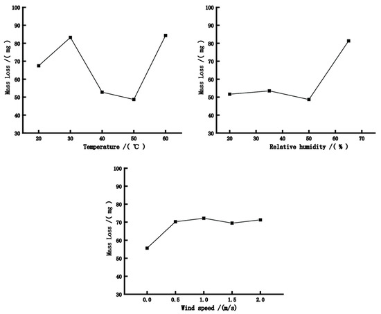 Wear resistance refers to the ability of the film to resist wear. Figure 5 shows the mass loss of the WBP film on the bamboo laminated lumber under different drying conditions, which reflects the wear resistance. The mass loss first increased and then decreased with temperature. However, when the temperature exceeded 50 °C, the mass loss again increased. This is because the curing speed of the coating is slow and emulsion particles move slowly at low temperatures, resulting in insufficient uniformity of the film; hence, it exhibits poor wear resistance. With the increase in temperature, the movement of emulsion particles became rapid, which improved the uniformity of the paint film leading to the increase in its wear resistance. In this experiment, the paint film structure achieved its best state at 50 °C. When the temperature exceeded 50 °C, the structure was damaged, resulting in decreased wear resistance. For the humidity values below 50%, the wear resistance of paint film remained unaffected; however, the mass loss increased considerably when the humidity values exceeded 50%. This is probably because the increase in relative humidity leads to the increase in the water content of the substrate, which affects the mechanical properties of the paint film and decreases its wear resistance. The mass loss of the paint film increased significantly when drying in the wind, but it had no significant effect on the mass loss of the paint film; the wear resistance tended to stabilise when the wind speed exceeded 0.5 m/s.
